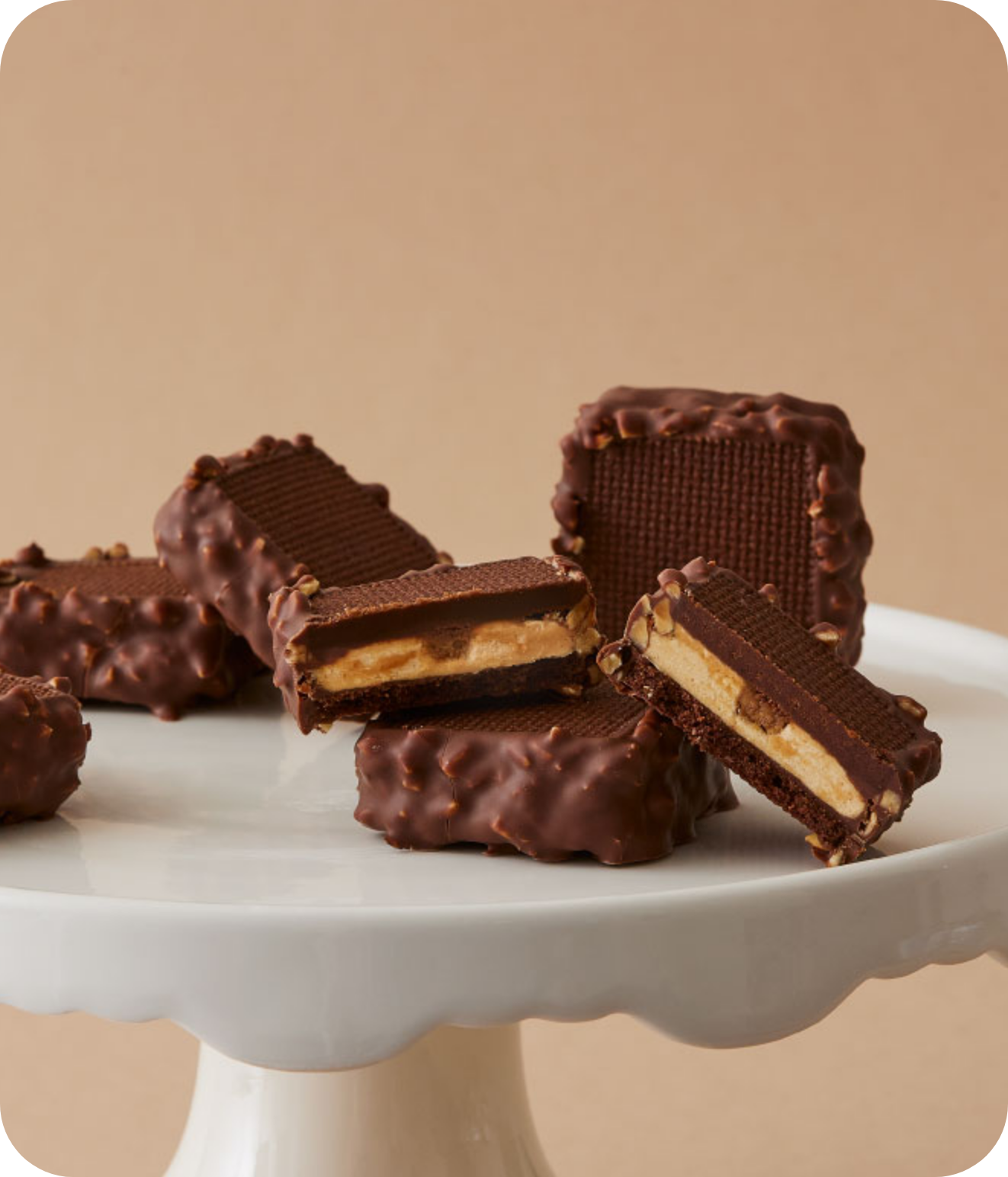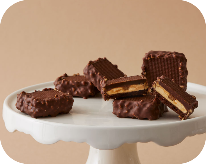 ナッツ風味のバタークリームとナッツペーストをカカオが香るショコラサブレでサンドし、砕いたアーモンドがたっぷり入った チョコレートで側面をコーティングしました。